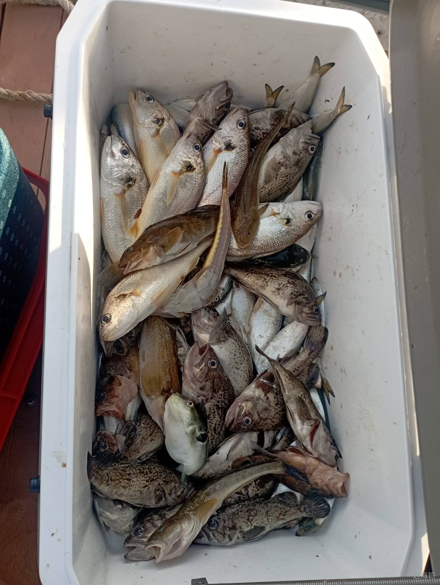 9.13京唐港6点半出发,暗坝一小时青皮四个人两箱子。转场锚地,可能偏晚了点,到位大黑头一人上了两,8两以上的,之后就慢蹦了,个头也不够大了。期间白姑出鱼也不错,一点左右,大白姑有一斤半以上,可算是给钓友掏着了。下午三点半出发转场近岸,浪太大,钓友湿身,哈哈,最后河豚没钓几个,原计划下螃蟹笼子也没搞。
